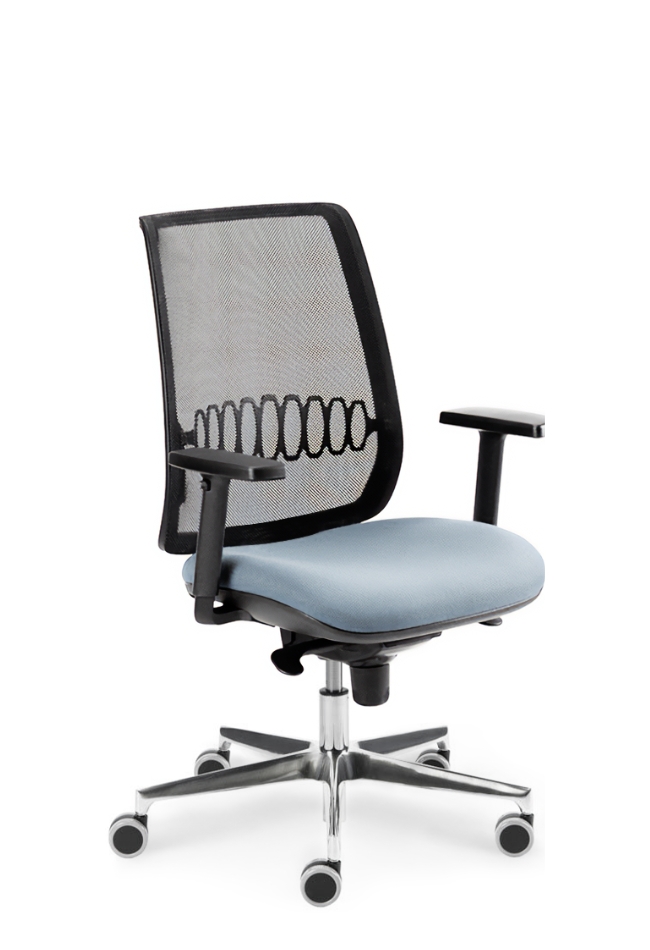 Base made of polished aluminum Ø 700 mm. Provided with timing mechanism.Seat height adjustment.Upholstered seat, back in black membrane with lumbar support. Height adjustable armrest in black nylon. 65mm wheels.