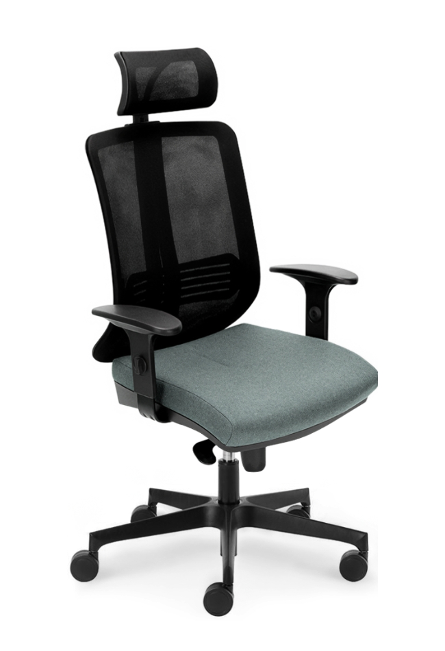 Base made of black nylon Ø 700 mm. Provided with timing mechanism.Seat tilt 9°, backrest tilt 20°, locking in 5 positions. Seat height adjustment.Upholstered seat, black mesh back. Height adjustable armrest in black nylon. 65mm wheels. Equipped with adjustable mesh headrest.