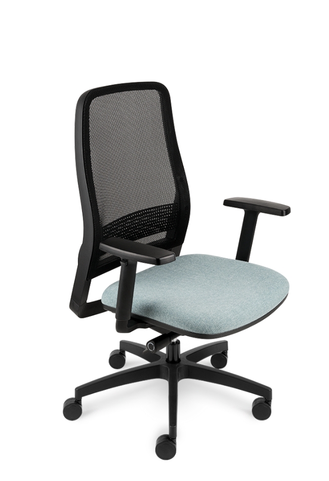Base made of black nylon Ø 700 mm. Provided with timing mechanism.Seat tilt 9°, backrest tilt 20°, locking in 5 positions. Seat height adjustment. Upholstered seat, breathable mesh back. Height adjustable armrest in black nylon. 65mm wheels.