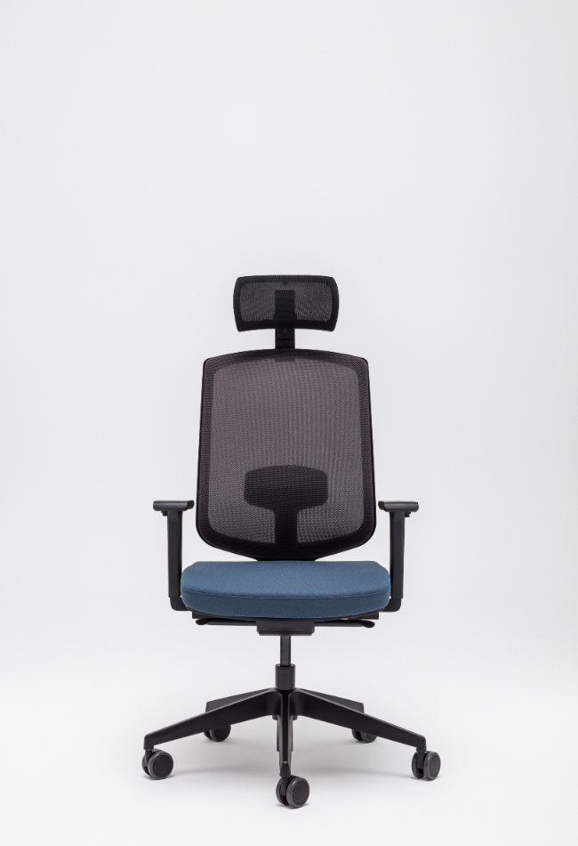 The chair can be customized: 2D-3D adjustable handles, polypropylene/aluminum base, wheels for hard or soft surfaces, lumbar support, headrest, Auto Synchro or Auto Synchro Pro mechanism.