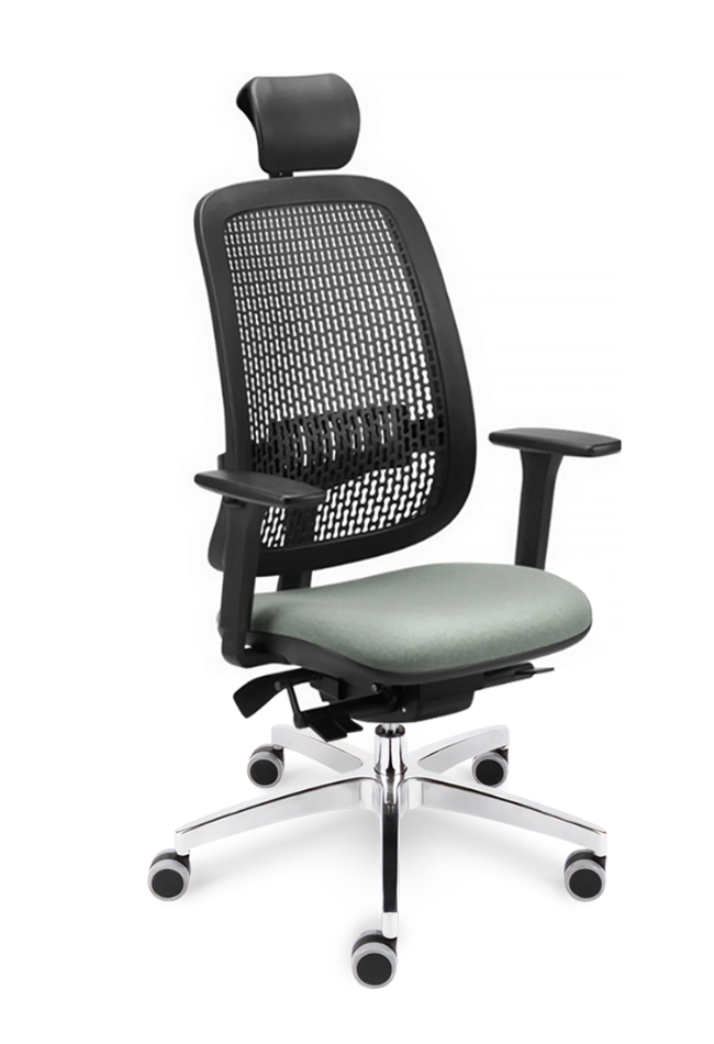 Base made of polished aluminum Ø 700 mm. Provided with timing mechanism.Seat tilt 13°, backrest tilt 22°, locking in 4 positions. Seat height adjustment.Upholstered seat, plastic back. Height adjustable armrest in black nylon. 65mm wheels. Supplied with plastic headrest.