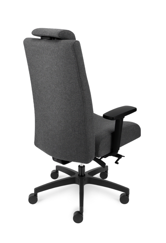 Base made of nehru nylon Ø 700 mm. Provided with timing mechanism.Seat tilt 8°, backrest tilt 23°, locking in 5 positions. Seat height adjustment.Upholstered seat, upholstered back on both sides. Height adjustable armrest in black nylon. 65mm wheels. Equipped with height-adjustable upholstered headrest.
