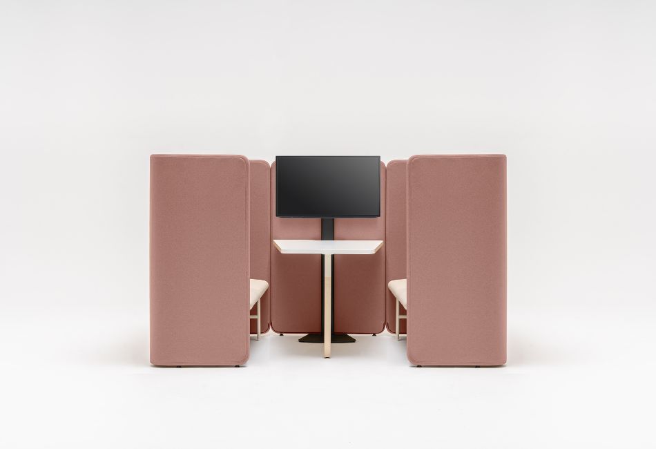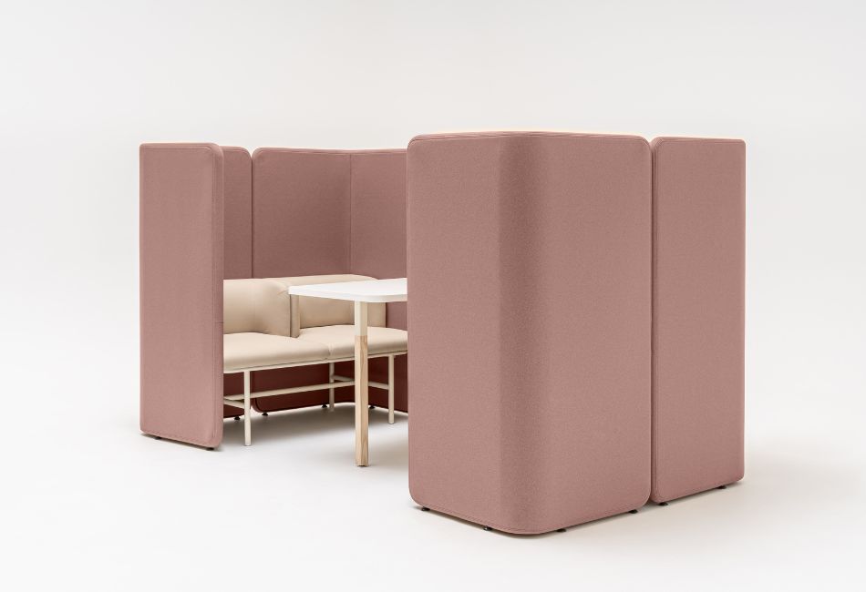 Panouri înalte care delimiteaza spațiul, tapițate cu materiale care blochează zgomotul.