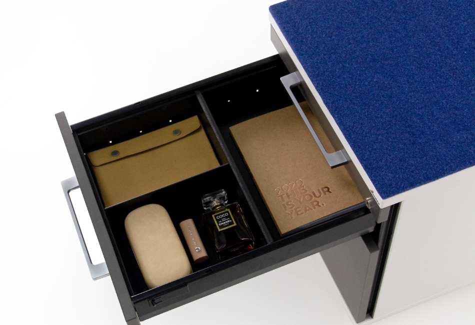 In functie de model este disponibil cu diferite tipuri de glisiere, de serare, 2-3-4 sertare, diverse accesorii: tavita organizator birotica, sertar pentru dosare suspendate, traverse de compartimentare, tavita de organizare birotica pe diagonala, pernuta.