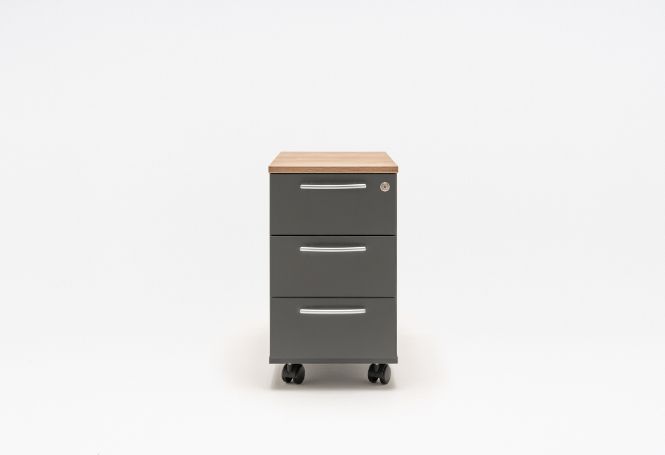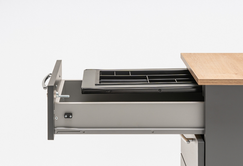 În funcție de model este disponibil cu sertar pentru dosare suspendate, extragere parțială 80%, capacitate maximă 30kg, sertare din pal melaminat sau sertare metalice.