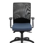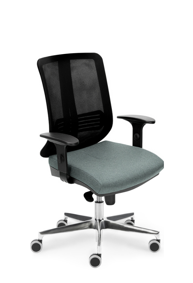 Bază realizată din aluminiu lustruit Ø 700 mm. Prevăzut cu mecanism de sincronizare. Înclinarea scaunului 9°, înclinarea spătarului 20° , blocare în 5 poziții . Reglarea înălțimii scaunului. Șezut tapițat, spătar din plasa neagră. Cotiera reglabilă pe înălțime din nailon negru. Roțile 65mm.