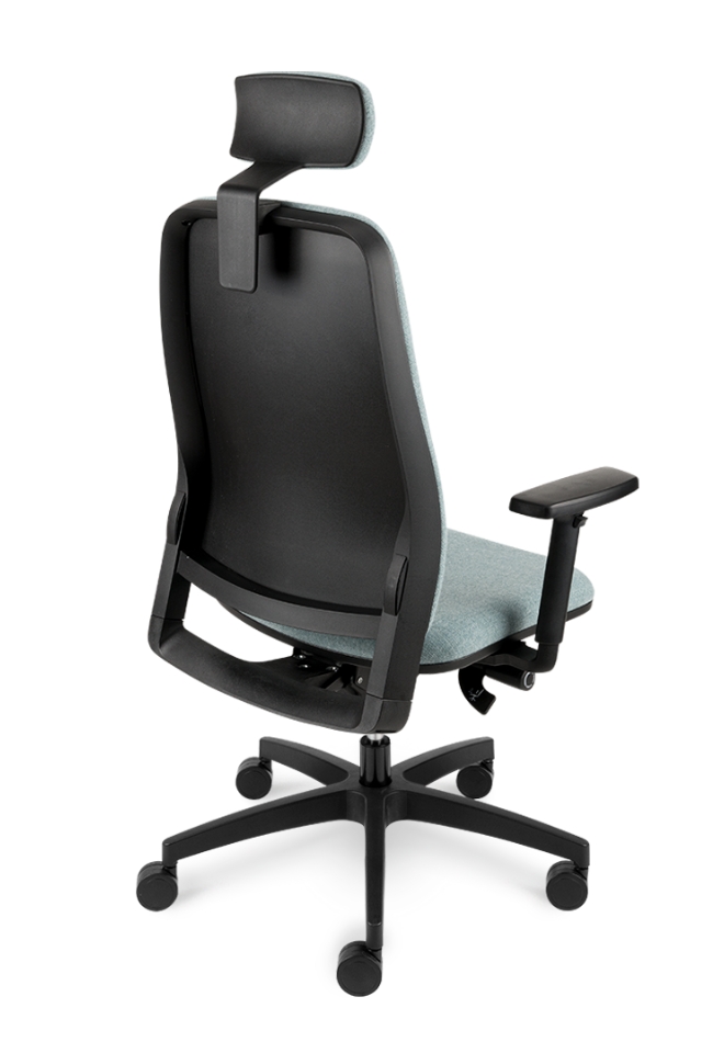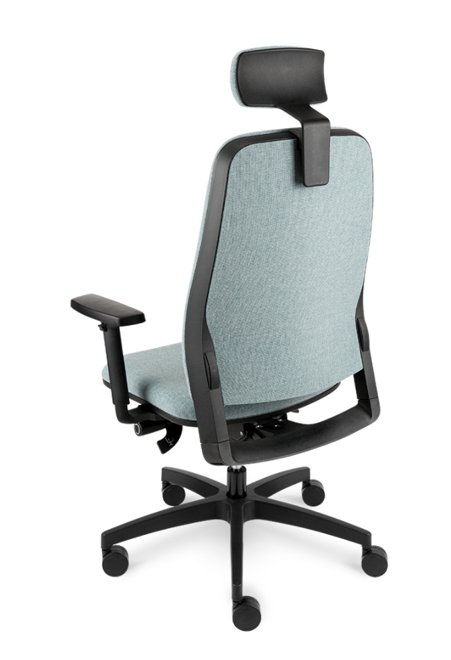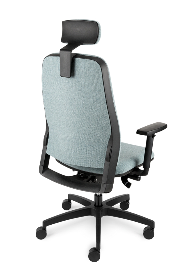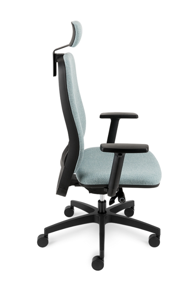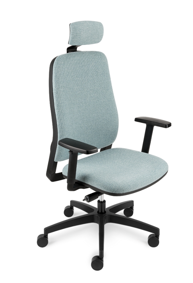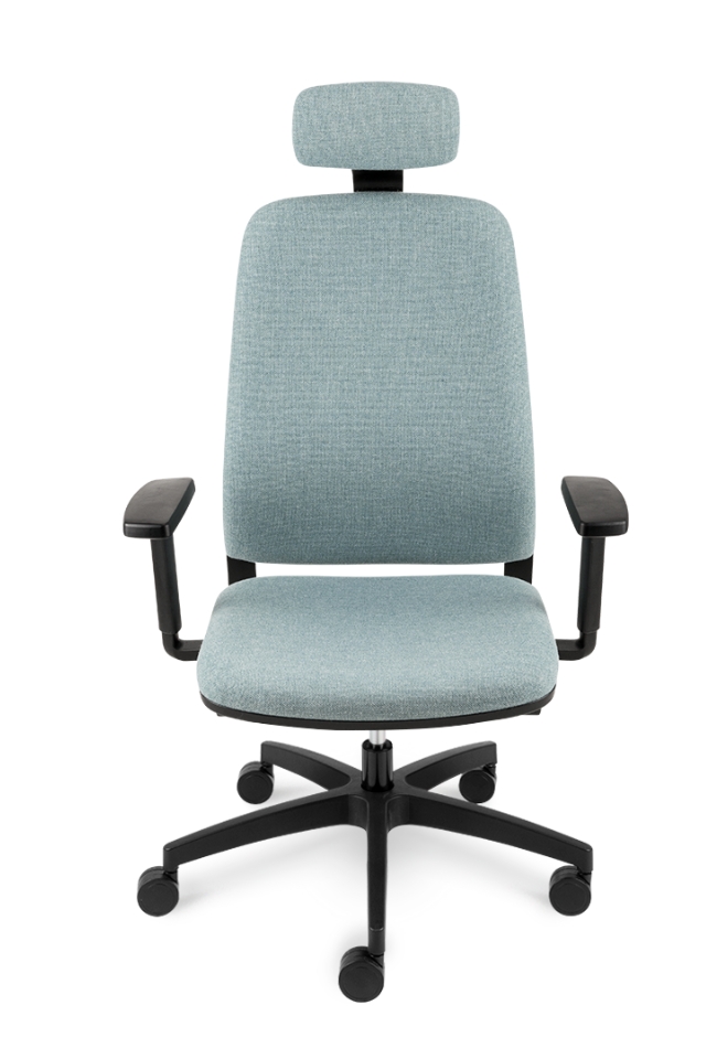 Bază realizată din nailon negru Ø 700 mm. Prevăzut cu mecanism de sincronizare. Înclinarea scaunului 9°, înclinarea spătarului 20° , blocare în 5 poziții . Reglarea înălțimii scaunului. Șezut și spătar tapitat. Cotieră reglabilă pe înălțime din nailon negru. Roțile 65mm. Prevăzut cu tetiera tapițată.