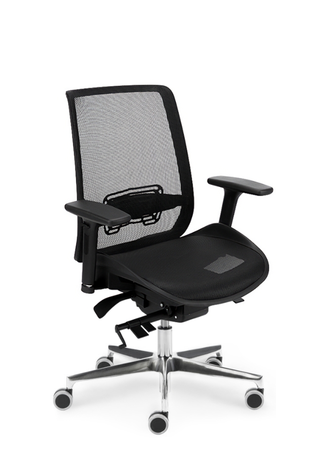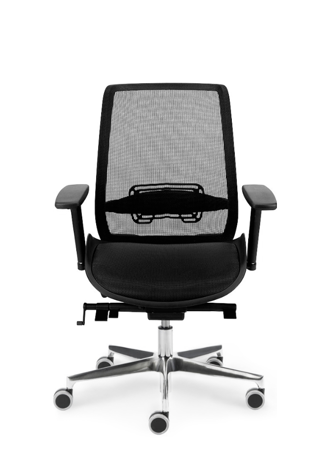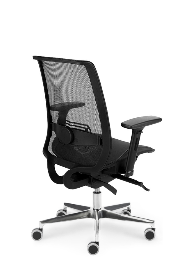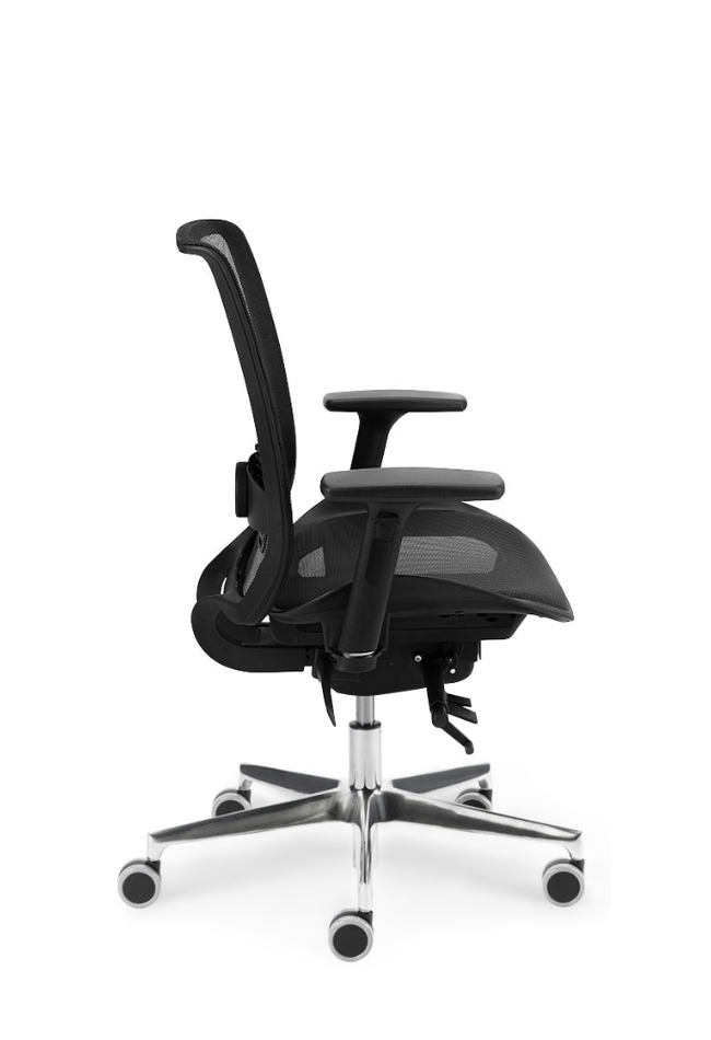Bază realizată din aluminiu lustruit Ø 700 mm. Prevăzut cu mecanism de sincronizare. Înclinarea scaunului 8°, înclinarea spătarului 23° , blocare în 5 poziții . Reglarea înălțimii scaunului. Șezut tapițat, spătar din membrană neagră. Cotiera reglabilă pe înălțime din nailon negru. Roțile 65mm.