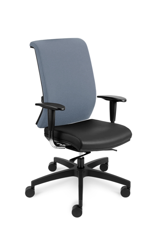 Bază realizată din nailon negru Ø 700 mm. Prevăzut cu mecanism de sincronizare. Înclinarea scaunului 5°, înclinarea spătarului 18° , blocare în 5 poziții. Reglarea înălțimii scaunului. Șezut și spătar tapitat. Cotieră reglabilă pe înălțime din polipropilena dura neagră. Roțile 65mm.