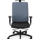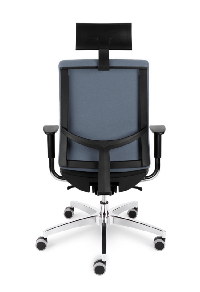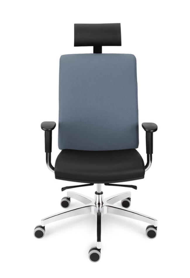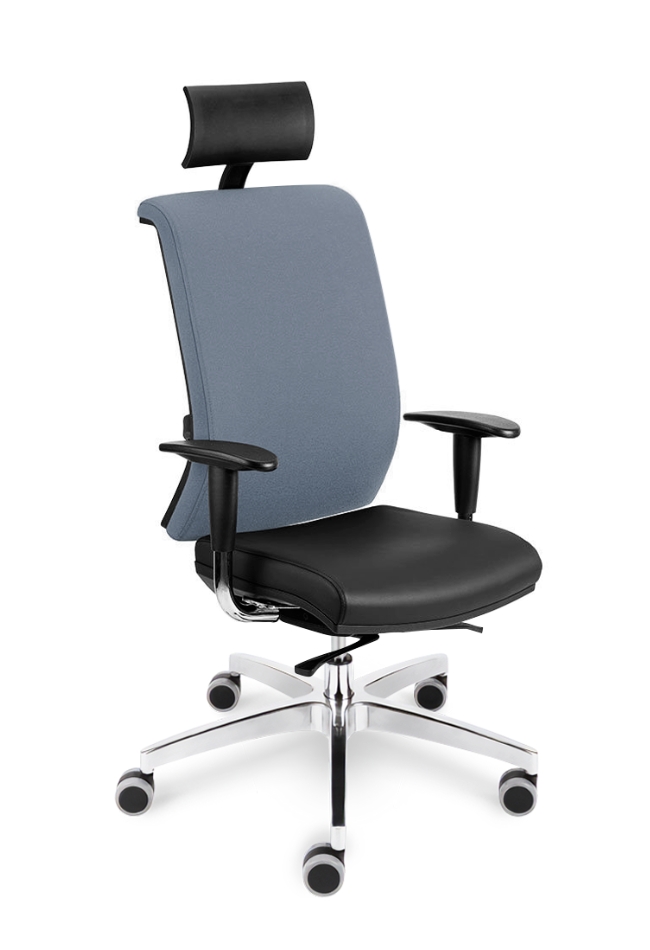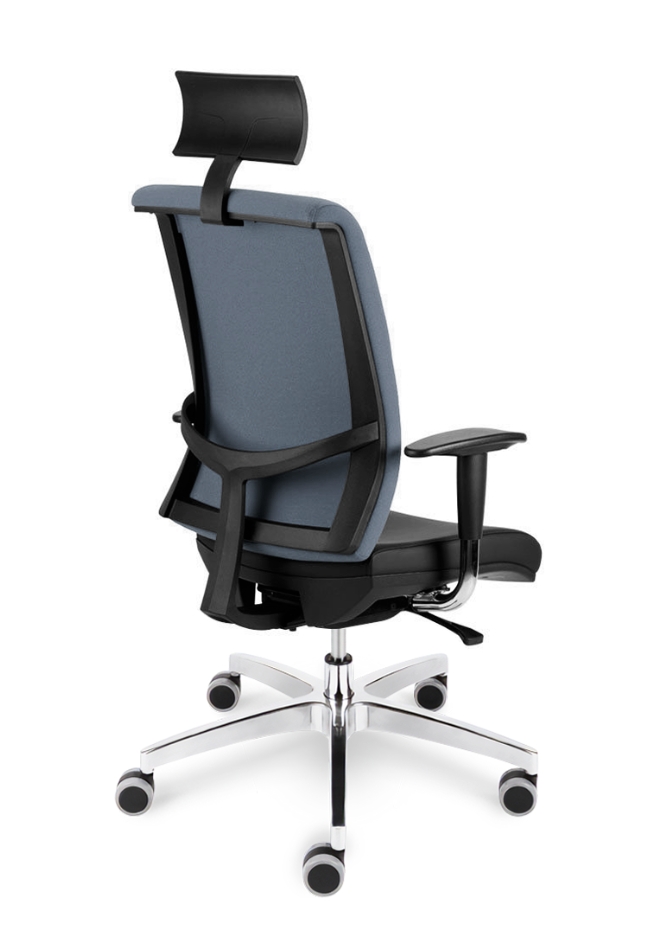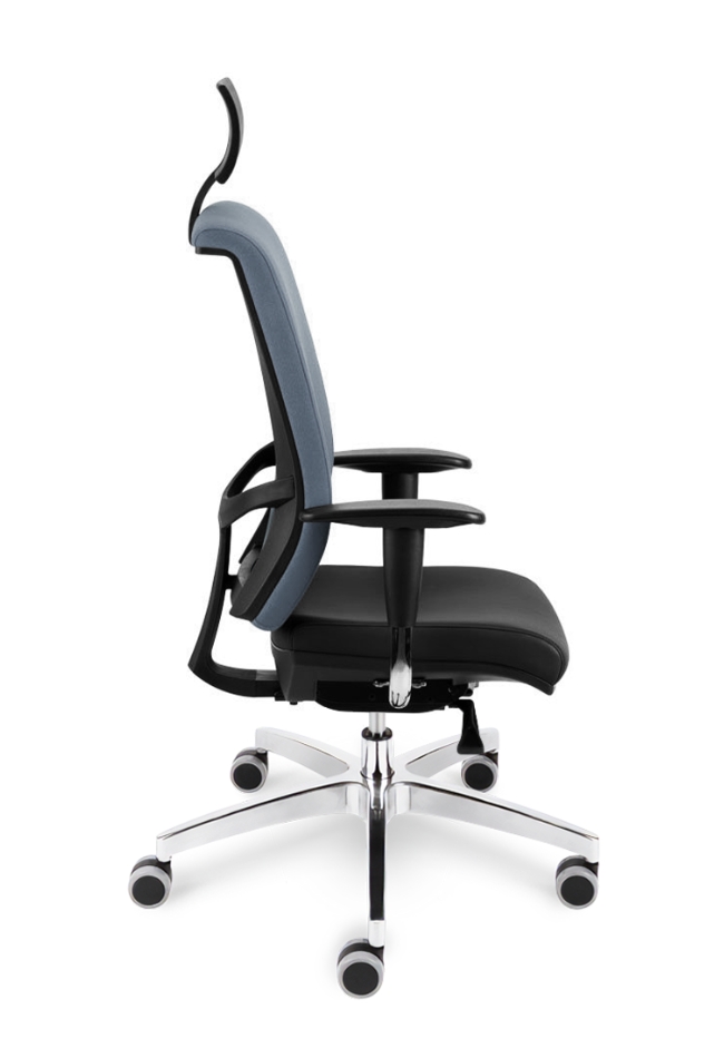 Bază realizată din aluminiu lustruit Ø 700 mm. Prevăzut cu mecanism de sincronizare. Înclinarea scaunului 5°, înclinarea spătarului 18° , blocare în 5 poziții . Reglarea înălțimii scaunului. Șezut și spătar tapițat. Cotiera reglabilă pe înălțime din polipropilena dura neagră. Roțile 65mm. Prevăzut cu tetiera tapițată cu reglare pe înălțime.